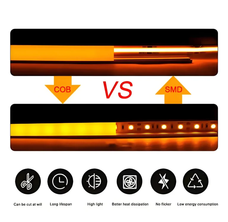 Comparing to Surface Mounted Devices(SMD) led strip, COB LED strips offer wider beam angle, higher CRI and more uniform lighting. It is with a 180-degree beam angle, Free cutting of LED cob light strip. 90 CRI and dotless light illumination, flexible, energy efficiency, excellent heat dissipation and long lifespan.
