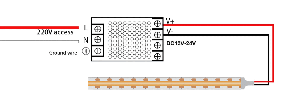 The working voltage of the COB led strip is DC 12V or DC 24V, it needs the constant voltage led driver (LED power supply) to light up as below.
