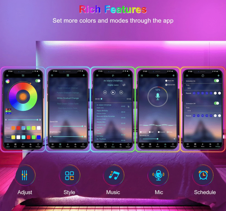 The RGB version supports the basic three primary colors—red, green, and blue—with control options for smooth color transitions, flashing, and other fundamental lighting effects, making it ideal for ambient lighting and simple decorative applications. The RGBIC version features built-in independent IC chips, enabling individual control of each segment of the strip. This allows for advanced dynamic effects such as chasing, flowing, and music-synchronized lighting, delivering more vibrant and diverse visual experiences suited for users with higher demands on lighting effects. Both types come with a Color Box smart control system, supporting app control and voice commands, and are compatible with smart platforms like Amazon Alexa and Google Assistant for convenient and intelligent lighting management.