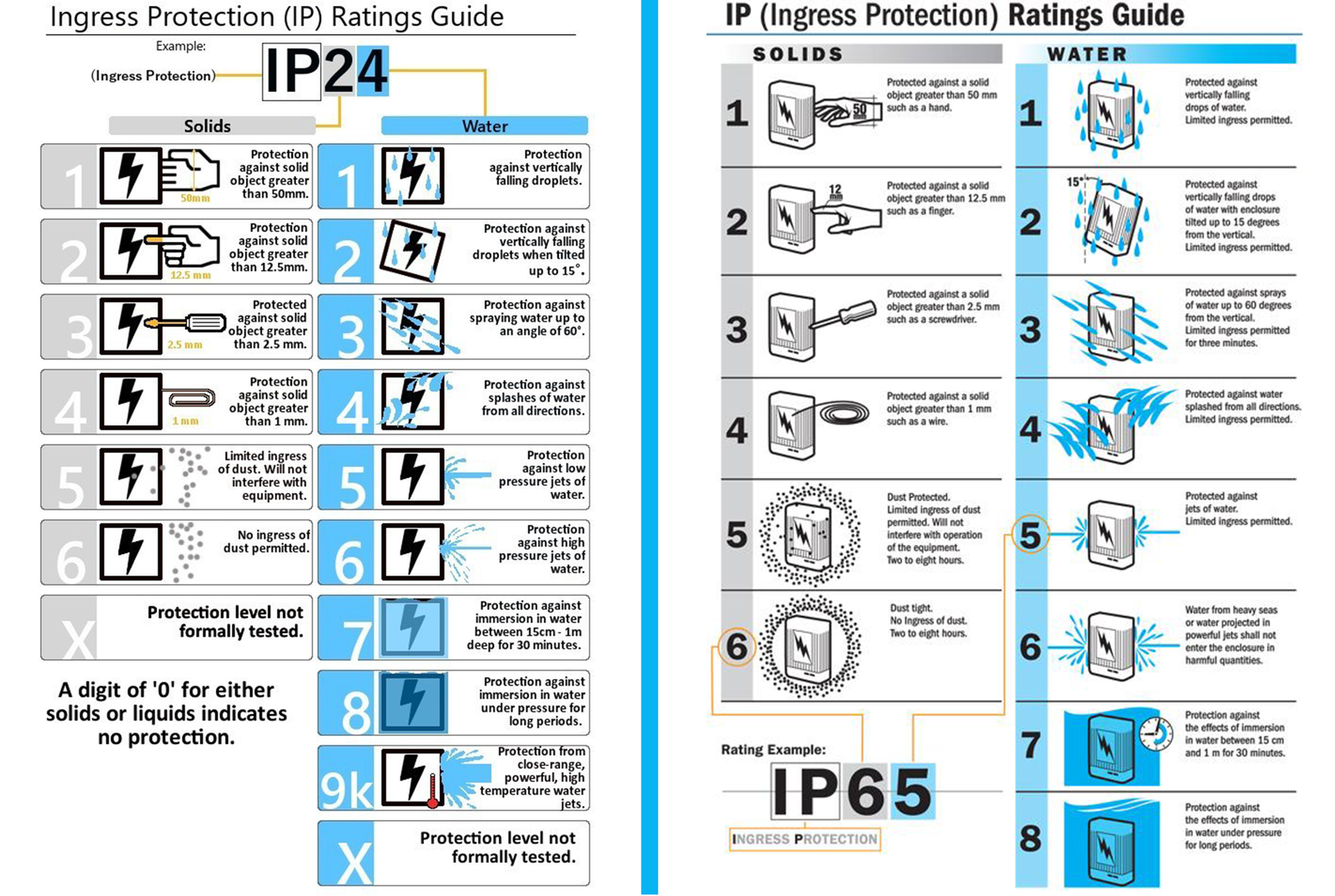 • The second digit represents the level of water protection (0–8, with higher numbers indicating better waterproof performance) Here is a comparison table of common IP ratings.