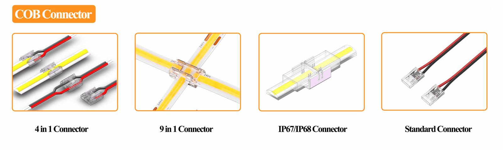 LED light strip connectors can be broadly divided into three main categories: COB connectors, SMD connectors, and Other connectors. COB connectors are designed specifically for COB strips, ensuring stable conductivity and easy installation to match the chip-on-board structure. SMD connectors are made for SMD strips, aligning with the soldering pads of the LEDs for quick, solder-free connections, making them a popular choice in flexible strip projects. Other connectors include DC plugs, PCB terminals, wire-to-wire connectors, and various adapters, offering wider compatibility with power supplies, controllers, and diverse applications. Together, these three categories cover the professional connection needs of different strip types while providing versatility and convenience for installation across multiple scenarios.