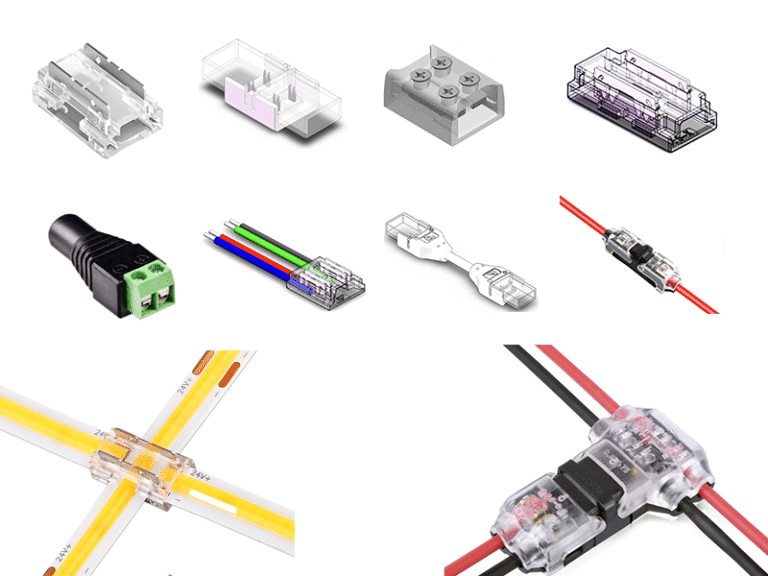 led strip connector is a small connector used to establish an electrical connection between LED strips or fixtures and power supplies or controllers. It works through mechanisms such as clips, pins, screws, or quick connectors to firmly link the strip’s electrodes with wires, eliminating the need for soldering, making installation simpler and more efficient, while ensuring stable and safe current transmission. Especially useful after cutting strips or when quick connections are required, led tape light connectors serves as both a convenient installation tool and a key component for improving efficiency and reliability in LED projects.