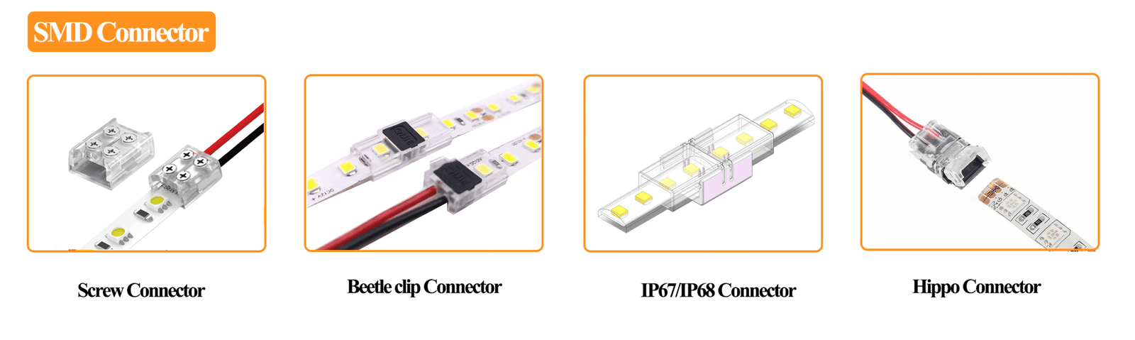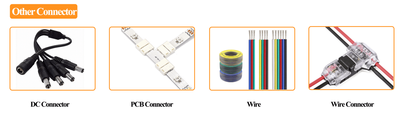 LED light strip connectors can be broadly divided into three main categories: COB connectors, SMD connectors, and Other connectors. COB connectors are designed specifically for COB strips, ensuring stable conductivity and easy installation to match the chip-on-board structure. SMD connectors are made for SMD strips, aligning with the soldering pads of the LEDs for quick, solder-free connections, making them a popular choice in flexible strip projects. Other connectors include DC plugs, PCB terminals, wire-to-wire connectors, and various adapters, offering wider compatibility with power supplies, controllers, and diverse applications. Together, these three categories cover the professional connection needs of different strip types while providing versatility and convenience for installation across multiple scenarios.