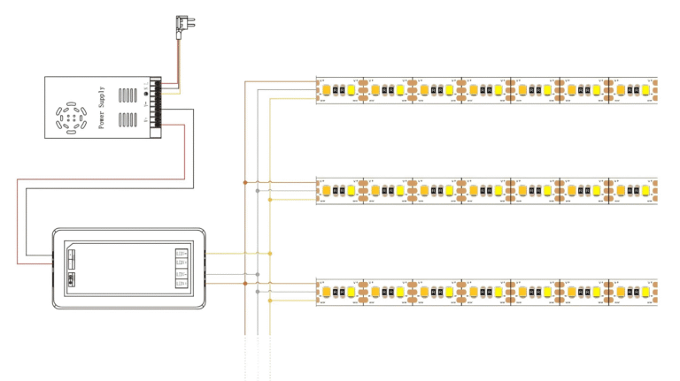 Mini cutting cuttable led strip lights are compatible with 5V, 12V, or 24V power supplies, with the appropriate driver selected based on the strip’s voltage. Single-color strips work with single-color controllers for brightness adjustment and on/off control, while dual-color temperature strips use CCT controllers to balance warm and cool white tones, creating various lighting atmospheres. The system is easy to install, highly compatible, and ideal for precise lighting applications.
