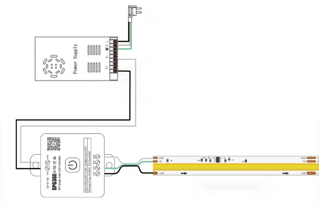 The working voltage of the COB led strip is DC 12V or DC 24V, it needs the constant voltage led driver (LED power supply) to light up as below.