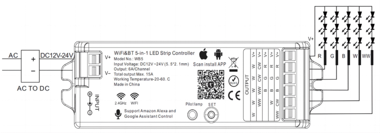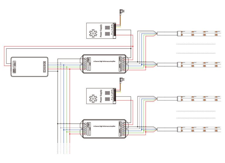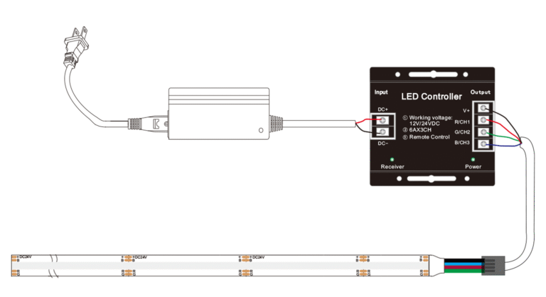 The working voltage of Standard RGB & RGBW led strip lights is DC12/24V , it needs the constant voltage led driver (LED power supply) and LED controller to light up as below.