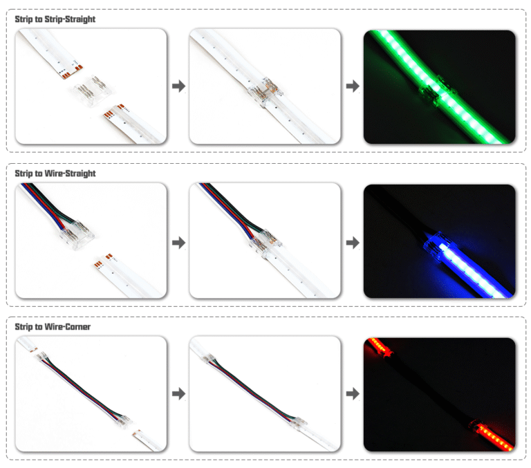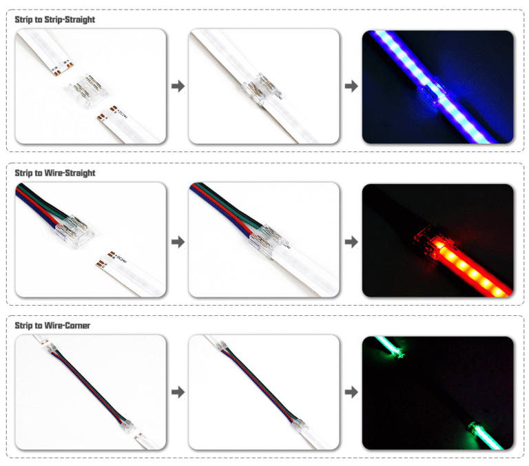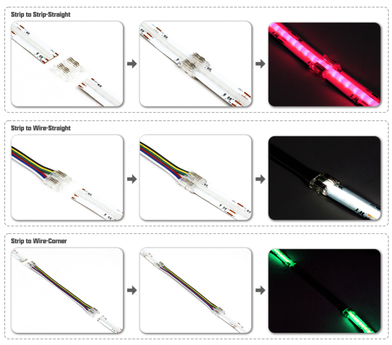 We have different type of connector to fit for different led strips. There are 2pin 3pin 4pin 5pin and 6pin to fit for 5mm 6mm 8mm 10mm 12mm PCB width LED strips. And there are Strip to Wire, Strip to Strip, Corner 3 different applications like below.