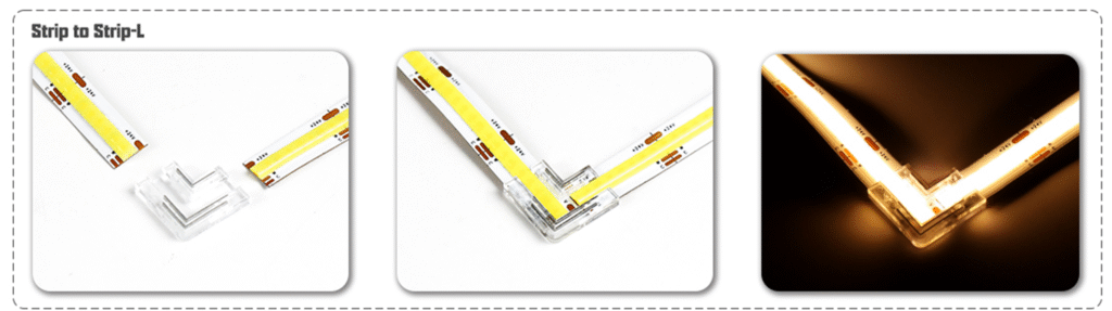 We have different type of connector to fit for different led strips. There are 2pin 3pin 4pin 5pin and 6pin to fit for 5mm 6mm 8mm 10mm 12mm PCB width LED strips. And there are Strip to Wire, Strip to Strip, Corner 3 different applications like below.